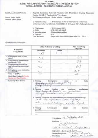 REMA MARINA, S.Sos.,M.I.P (2022) Peer Review "Beyond Economic Survival: Women with Disabilities Coping Strategies During Covid-19 Pandemic in Yogyakarta". Sekolah Tinggi Pembangunan Masyarakat Desa "APMD".
