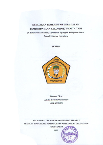 WAMBRAUW, AMELIA ETRIDA (2022) Kebijakan Pemerintah Desa Dalam Pemberdayan Kelompok Wanita Tani di Kalurahan Srimartani, Kapanewon Piyungan, Kabupaten Bantul, Daerah Istimewa Yogyakarta). Sarjana thesis, Sekolah Tinggi Pembangunan Masyarakat Desa "APMD".