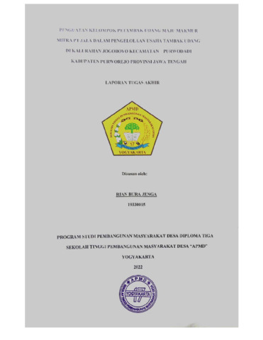 Bura Jenga, Rian (2022) PENGUATAN KELOMPOK PETANI UDANG MAJU MAKMUR PT JALA DALAM PENGELOLAAN USAHA TAMBAK UDANG DI KALURAHAN JOGOBOYO KECAMATAN PURWODADI KABUPATEN PURWOREJO PROVINSI JAWA TENGAH. Diploma thesis, Sekolah Tinggi Pembangunan Masyarakat Desa STPMD "APMD".