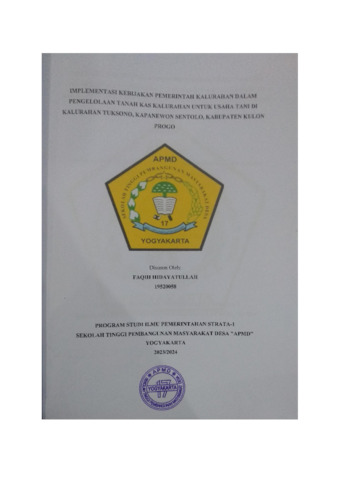 HIDAYATULLAH, FAQIH (2024) IMPLEMENTASI KEBIJAKAN PEMERINTAH KELURAHAN DALAM PENGELOLAAN TANAH KAS KELURAHAN UNTUK USAHA TANI DI KALURAHAN TUKSONO , KAPANEWON SENTOLO, KABUPATEN KULON PROGO. Sarjana thesis, Sekolah Tinggi Pembangunan Masyarakat Desa STPMD" APMD".