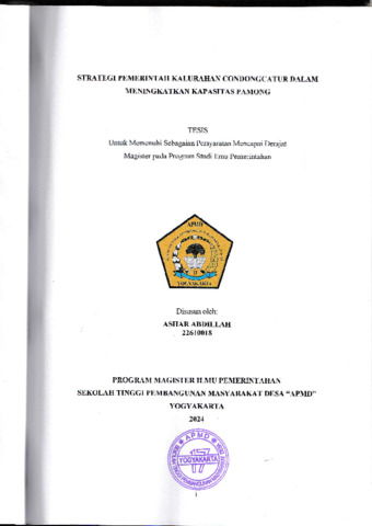 Puji dan syukur penulis panjatkan kehadirat Tuhan Yang Maha Esa yang telah melimpahkan Rahmat dan Karunia-Nya, sehingga penulis dapat menyelesaikan penelitian tesis sebagai salah satu persyaratan menyelesaikan program Magister (S-2) Ilmu Pemerintahan di Sekolah Tinggi Pembangunan Masyarakat Desa “APMD” Yogyakarta. Pada kesempatan ini penulis menyadari bahwa dalam usaha penyusunan penelitian tesis dengan judul “STRATEGI PEMERINTAH KALURAHAN CONDONGCATUR DALAM MENINGKATKAN KAPASITAS PAMONG” tidak luput dari kekurangan, kesulitan, hambatan maupun rintangan, sehingga dalam penyusunan penelitian tesis ini penulis merasa masih jauh dari kata sempurna. Terselesaikannya tesis ini tidak terlepas dari bantuan berbagai pihak yang telah memberikan bimbingan maupun saran-saran yang berguna dalam penyusunan penelitian tesis ini. Untuk itu penulis mengucapkan terima kasih yang sebesar-besarnya kepada: