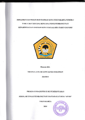 JANUAR GONCAVELS SURATMAN, TRIANUS (2024) IMPLEMENTASI PERATURAN DAERAH KOTA YOGYAKARTA NOMOR 3 TAHUN 2015 TENTANG RENCANA INDUK PEMBANGUNAN KEPARIWISATAAN DAERAH KOTA YOGYAKARTA TAHUN 2015-2025. Masters thesis, Sekolah Tinggi Pembangunan Masyarakat Desa STPMD "APMD".