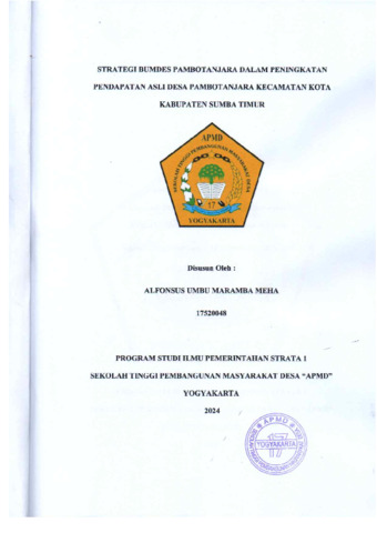 Maramba meha, Alfonsus umbu (2024) STRATEGI BUMDES PAMBOTANJARA DALAM PENINGKATAN PENDAPATAN ASLI DESA. Sarjana thesis, Sekolah Tinggi Pembangunan Masyarakat Desa "APMD".
