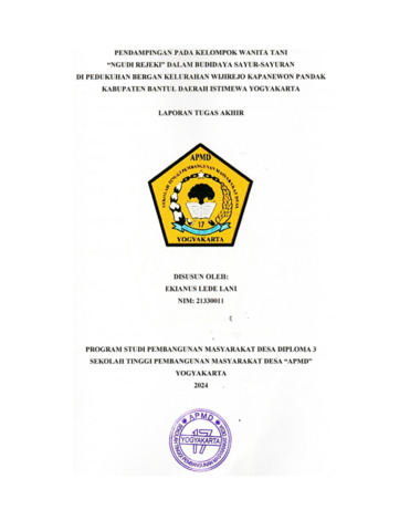 Lede Lani, Ekianus (2024) Pendampingan PadaKelompok Wanita Tani"Ngudi Rejeki 'Dalam Budidaya Sayur-sayuran Di pedukuhan Bergan Kelurahan Wijirejo Kapanewon Pandak Kabupaten Bantul DIY. Diploma thesis, Sekolah Tinggi Pembangunan Masyarakat Desa STPMD "APMD".
