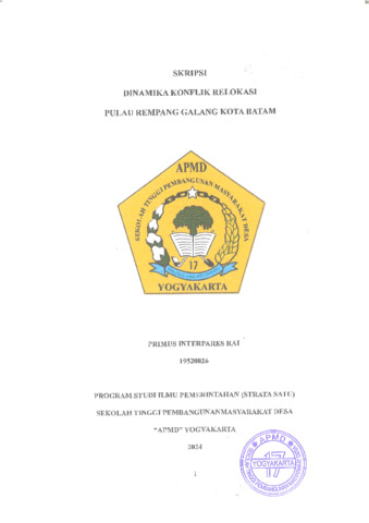 INTERPARES RAI, PRIMUS (2024) DINAMIKA KONFLIK RELOKASI PULAU REMPANG GALANG KOTA BATAM. Sarjana thesis, Sekolah Tinggi Pembangunan Masyarakat Desa STPMD "APMD".