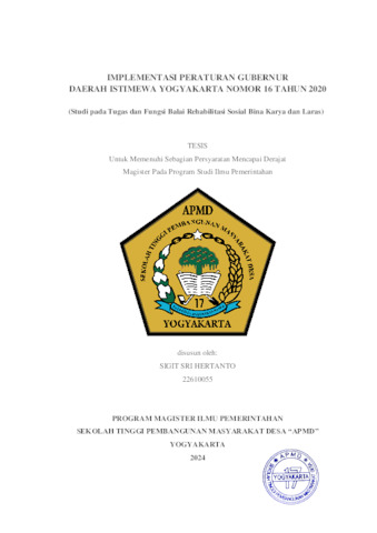 Sri Hertanto, Sigit (2024) IMPLEMENTASI PERATURAN GUBERNUR DAERAH ISTIMEWA YOGYAKARTA NOMOR 16 TAHUN 2020 (Studi pada Tugas dan Fungsi Balai Rehabilitasi Sosial Bina Karya dan Laras). Masters thesis, Sekolah Tinggi Pembangunan Masyarakat Desa "APMD".