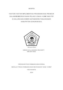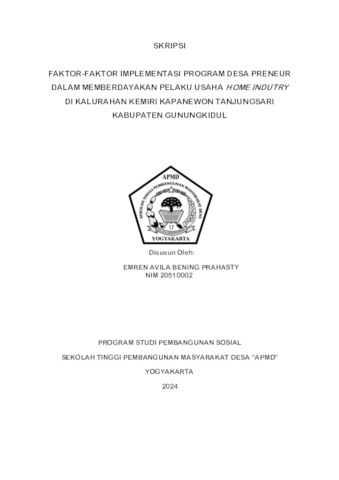 AVILA BENING PRAHASTY, EMREN (2024) FAKTOR-FAKTOR IMPLEMENTASI PROGRAM DESA PRENEUR DALAM MEMBERDAYAKAN PELAKU USAHA HOME INDUTRY DI KALURAHAN KEMIRI KAPANEWON TANJUNGSARI KABUPATEN GUNUNGKIDUL. [Experiment]