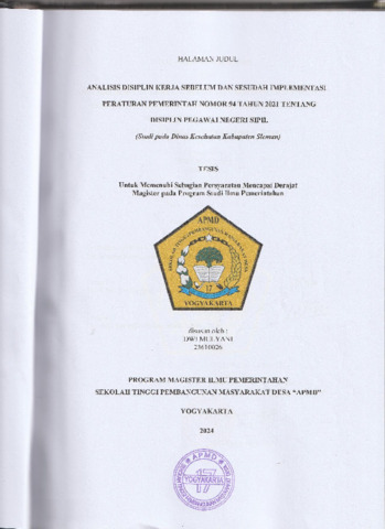 Mulyani, Dwi (2024) ANALISIS DISIPLIN KERJA SEBELUM DAN SESUDAH IMPLEMENTASI PERATURAN PEMERINTAH NOMOR 94 TAHUN 2021 TENTANG DISIPLIN PEGAWAI NEGERI SIPIL. Masters thesis, Sekolah Tinggi Pembangunan Masyarakat Desa STPMD "APMD".