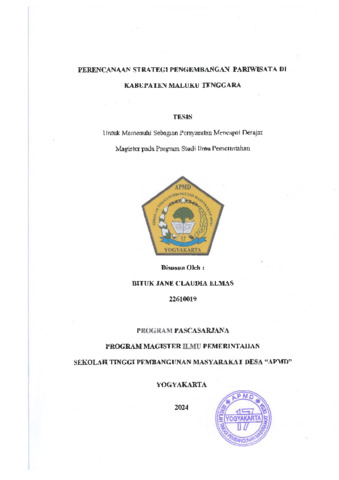 Jane Cluadia Elmas, Bituk (2024) PERENCANAAN STRATEGI PENGEMBANGAN PARIWISATA DI KABUPATEN MALUKU TENGGARA. Masters thesis, Sekolah Tinggi Pembangunan Masyarakat Desa STPMD "APMD".
