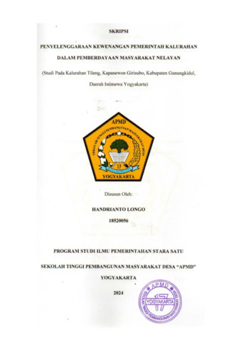 INTISARI Penelitian ini mengkaji tentang penyelenggaraan kewenangan pemerintah kalurahan dalam pemberdayaan masyarakat nelayan di Kalurahan Tileng. Permasalahan dalam penelitian ini yaitu berkaitan dengan banyaknya penduduk Tileng yang beralih profesi dari nelayan menjadi petani pesisir, karena minimnya fasilitas penunjang bagi para nelayan seperti alat tangkap ikan dan fasilitas perahu yang kurang memadai, sehingga mempengaruhi hasil tangkap nelayan menjadi tidak maksimal. Teori yang digunakan dalam penelitian ini yaitu teori Governability yang kemudian dikaitakan dengan konsep pemberdayaan yang dikembangkan oleh Sobirin (2008). Berangkat dari permasalahan tersebut, maka pertanyaan yang peneliti ajukan dalam penelitian ini adalah: “Bagaimana Penyelenggaraan Kewenangan Pemerintah Kalurahan Dalam Pemberdayaan Masyarakat Nelayan Di Kalurahan Tilang Kecamatan Girisubo Kabupaten Gunungkidul”? Penelitian ini menggunakan metode penelitian Kualitatif dengan pendekatan Deskriptif. Tujuan dari penelitian ini adalah untuk menyelidiki dan menjangkau informasi faktual perihal proses pemberdayaan masyarakat nelayan oleh Pemerintah Kalurahan Tileng. Adapun teknik pengumpulan data yang digunakan yaitu meliputi observasi, wawancara dan dokumentasi. Selanjutnya, data maupun informasi yang telah peneliti himpun kemudian dianalisis dengan menggunakan sistem reduksi data, penyajian data dan penarikan kesimpulan. Hasil penelitian menunjukkan bahwa program pemberdayaan masyarakat nelayan yang dilakukan oleh Pemerintah Kalurahan Tileng yaitu meliputi: 1) Program Pembangunan Gedung Sekolah Alam Pesisir; 2) Pelatihan Penangkapan dan Pengolahan Ikan Laut; 3) Pembangunan dan Pemanfaatan Rumah Olahan; 4) Pemberian Bantuan Dana dan Pengadaan Fasilitas; dan 5) Pembangunan Kios Maritim. Kelima program pemberdayaan tersebut juga merupakan satu rangkaian dalam proses pengembangan program Kalurahan Budaya Maritim di Kalurahan Tileng, di mana dalam pengembangan program tersebut juga bertujuan untuk penguatan peran masyarakat nelayan setempat sebagai salah satu sektor yang bersentuhan langsung dengan budaya kemaritiman itu sendiri. Adapun manfaat yang telah diperoleh kelompok nelayan dari program pemberdayaan tersebut yaitu meliputi: 1) adanya peningkatan keterampilan nelayan melalui pemanfaatan sekolah alam maritim dan kegiatan pelatihan di dalamnya; 2) kelompok nelayan dapat mengolah hasil tangkapannya menjadi bakso ikan, abon dan nugget ikan tuna melalui proses produksi di rumah olahan; 3) masyarakat nelayan dapat meningkatkan produktivitas usaha kelompoknya dengan memanfaatkan bantuan dana dan fasilitas alat penangkap ikan dari pemerintah kalurahan; dan 4) kios maritim telah dimanfaatkan oleh kelompok nelayan untuk menjual ikan hasil tangkapan dan produk olahan mereka. Namun dalam perkembangannya, programprogram pemberdayaan tersebut belum mampu dimanfaatkan dikembangkan secara optimal oleh kelompok nelayan dalam meningkatkan produktivitas usaha kelompoknya. Hal tersebut dikarenakan kelompok nelayan belum memiliki perahu besar yang dapat digunakan untuk mencari ikan ke tengah laut, serta masih minimnya alat atau mesin olahan di rumah olahan. Kata Kunci: Penyelenggaraan Kewenangan, Pemerintahan Kalurahan, Pemberdayaan, Masyarakat Nelayan. xii