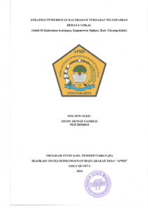 Penelitian ini berfokus pada upaya yang dilakukan oleh pemerintah kalurahan di Katongan untuk melestarikan budaya lokal. Hal ini mencakup strategi yang diterapkan dalam menjaga dan mengembangkan tradisi, kesenian, dan nilainilai budaya masyarakat setempat. Analisis dilakukan melalui pendekatan kualitatif untuk mengidentifikasi strategi, program, dan partisipasi masyarakat dalam proses pelestarian budaya. Selain itu, penelitian ini juga mengeksplorasi tantangan yang dihadapi serta dampak dari strategi tersebut terhadap keberlangsungan budaya lokal di Kalurahan Katongan. Penelitian ini mempunyai tujuan melihat dampak sekaligus menganalisis dan mengevalusasi terhadap praktis program Desa Mandiri Budaya di Kalurahan Katongan pada aspek pelestarian kebudayaan dan adat istiadat serta melihat peran dari stekhoulder (masyarakat, pemerintah Kalurahan. Swasta). Penelitian ini dilakukan di Kalurahan Katongan, Kabupaten Gunungkidul, Provinsi Daerah Istimewa Yogyakarta. Penelitian ini memakai pendekatan Kualitatif deskriptif dengan sumber data primer dan sekunder. Data primer diperoleh melalui wawancara dengan 8 informan serta obeservasi, sementara data sekunder diperoleh melalui dokumentasi terkait profil Kalurahan. Hasil penelitian menunjukkan bahwa meskipun ada tantangan, strategi yang diterapkan oleh pemerintah Kalurahan Katongan relatif efektif dalam melestarikan budaya lokal namun tetap memerlukan dukungan yang lebih kuat dari pemerintah dan partisipasi aktif masyarakat, terutama generasi muda. Serta upaya untuk meningkatkan kesadaran dan keterlibatan masyarakat sangat penting untuk menjaga keberlangsungan budaya lokal di tengah arus globalisasi. Kata Kunci : Strategi, Desa Mandiri Budaya,Katongan