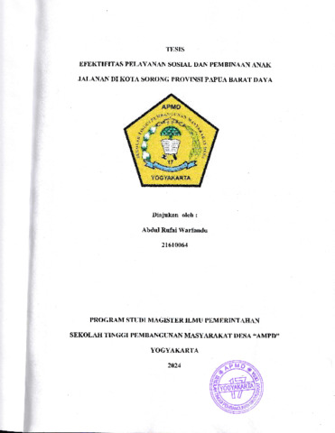 Rufai Warfandu, Abdul (2024) EFEKTIFITAS PELAYANAN SOSIAL DAN PEMBINAAN ANAK JALANAN DI KOTA SORONG PROVINSI PAPUA BARAT DAYA. Masters thesis, Sekolah Tinggi Pembangunan Masyarakat Desa STPMD "APMD".