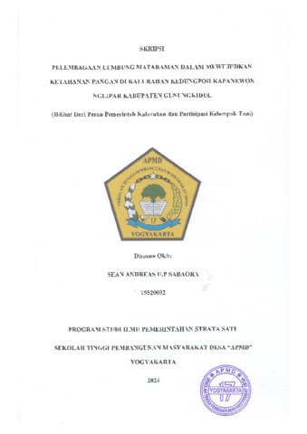 SABAORA, SEAN ANDREAS U.P (2024) PELEMBAGAAN LUMBUNG MATARAMAN DALAM MEWUJUDKAN KETAHANAN PANGAN DI KALURAHAN KEDUNGPOH KAPANEWON NGLIPAR KABUPATEN GUNUNGKIDUL. Sarjana thesis, Sekolah Tinggi Pembangunan Masyarakat Desa STPMD "APMD".