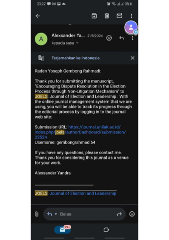 Gembong Rahmadi, Raden Yoseph and Firdaus, Mohamad Korespondensi "Encouraging Dispute Resolution in the Election Process through Non-Litigation Mechanism". Sekolah Tinggi Pembangunan Masyarakat Desa "APMD".