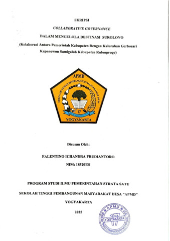 INTISARI Skripsi ini membahas proses Collaborative Governance dalam mengelola desttinasi wisata suroloyo di Kalurahan Gerbosari, Kapanewon Samigauh, Kabupaten Kulonprogo, Provinsi Daerah Istimewa Yogyakarta. Spesifikasi wisata suroloyo diawali dari mulainya keterbatasan Pemerintahan Kalurahan Gerbosari dalam mengelola objek wisata maka diperlukannya kolaborasi antara pemerintah Daerah dengan pemerintah Kalurahan Gerbosari untuk mengelola dan memajukan destinasi wisata suroloyo supaya wisata suroloyo tidak hanya dikelola oleh satu pihak saja. Penelitian ini menggunakan metode penelitian kualitatif eksploratif. Teknik pengumpulan data yang digunakan meliputi observasi, wawancara, dan dokumentasi. Sumber data dipilih dengan metode purposive sampling, yaitu pemilihan sampel berdasarkan pertimbangan tertentu. Informan dikelompokkan dan diberikan pertanyaan yang sesuai dengan kapasitasnya, sehingga memudahkan peneliti untuk mengeksplorasi objek atau situasi sosial yang sedang diteliti. Hasil penelitian menunjukkan bahwa permasalahan yang terkait dengan Pengelolaan desa wisata, hal ini terjadi Kurangnya peran pemerintah desa. Dengan kata lain, proses pelaksanaan program kegiatan Pemerintah Desa/Kalurahan Gerbosari belum optimal, selain itu juga terdapat permasalahan seperti faktor pendukung yang kurang memadai, temuan lain di lapangan yakni pelaksanaan pengelolaanya dilaksanakan oleh Dinas Pariwisata Kabupaten Kulon Progo, selain itu tidak semua masyarakat Kalurahan Gerbosari menikmati hasil serta mendapatkan keuntungan dari pengelolaan wisata puncak Suroloyo. Kata Kunci: Collaborative Governance, Pengelolaan, Pemberdayaan