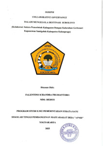 Frudiantoro, Falentino Ichandra (2024) COLLABORATIVE GOVERNANCE DALAM MENGELOLA DESTINASI SUROLOYO. Sarjana thesis, Sekolah Tinggi Pembangunan Masyarakat Desa STPMD "APMD".
