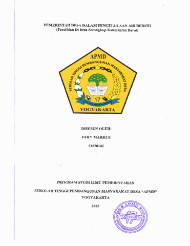 MARKUS, FERY (2025) PEMERINTAH DESA DALAM PENGELOLAAN AIR BERSIH (Penelitian Di Desa Setungkup Kalimantan Barat). Sarjana thesis, Sekolah Tinggi Pembangunan Masyarakat Desa STPMD "APMD".