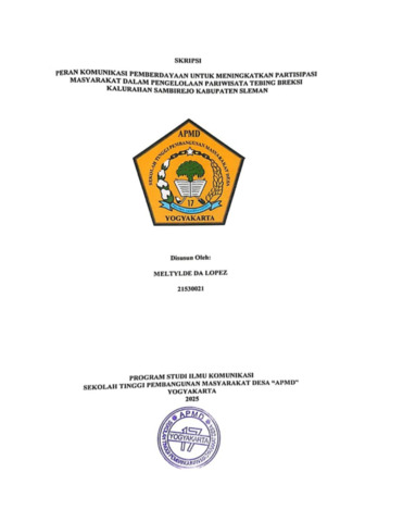 Da Lopez, Meltylde (2025) PERAN KOMUNIKASI PEMBERDAYAAN UNTUK MENINGKATKAN PARTISIPASI MASYARAKAT DALAM PENGELOLAAN PARIWISATA TEBING BREKSI KALURAHAN SAMBIREJO KABUPATEN SLEMAN. Sarjana thesis, Sekolah Tinggi Pembangunan Masyarakat Desa "APMD".