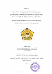 KAMUSON, FRENANDEMENZ REALINO (2024) PERAN PEMERINTAH DAN PARTISIPASI MASYARAKAT KALURAHAN DALAM PEMBANGUNAN INFRASTRUKTUR GUNA MEWUJUDKAN KESEJAHTERAAN MASYARAKAT DESA (Penelitian di Kalurahan Widodomartani Kapanewon Ngemplak Kabupaten Sleman Daerah Istimewa Yogyakarta). Sarjana thesis, Sekolah Tinggi Pembangunan Masyarakat Desa STPMD "APMD".