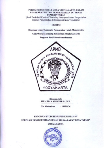 Hilarian Arischi Hadur, Hadur PERAN INSPEKTORAT KOTA YOGYAKARTA DALAM PENERAPAN SISTEM PENGENDALIAN INTERNAL PEMERINTAHAN(Studi Deskriptif Kualitatif Terhadap Penerapan Sistem Pengendalian Internal Pemerintahan di Inspektorat Kota Yogyakarta). [Experiment]