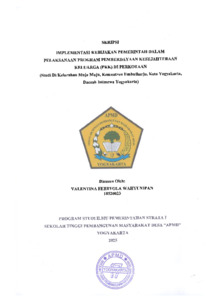 INTISARI Salah satu organisasi yang berikhtiar untuk memberdayakan kaum perempuan di desa adalah Pemberdayaan Kesejahteraan Keluarga (PKK). Organisasi PKK bertujuan untuk memberdayakan perempuan agar dapat menjadi pribadi yang mandiri dan dapat membina keluarganya. Pemberdayaan Kesejahteraan Keluarga (PKK) memang memiliki dasar hukum yang kuat melalui Peraturan Menteri Dalam Negeri (Permendagri) Nomor 36 Tahun 2020. Peraturan ini merupakan pelaksanaan dari Peraturan Presiden Nomor 99 Tahun 2017 tentang Gerakan Pemberdayaan dan Kesejahteraan Keluarga. Berdasarkan data dari Profil Kelurahan, jumlah penduduk Kelurahan Muja Muju pada tahun 2024 adalah 10.956 jiwa dengan 3.670 Kepala Keluarga (KK), di mana jumlah penduduk perempuan mencapai 5.562 jiwa, sedangkan laki-laki berjumlah 5.387 jiwa. Hal ini menunjukkan bahwa di Kelurahan Muja Muju, perempuan mendominasi jumlah penduduk. Di Kelurahan Muja Muju, Pemberdayaan Kesejahteraan Keluarga (PKK) berperan sebagai wadah penting dalam menampung dan menyuarakan aspirasi perempuan terkait pembangunan kelurahan. Melalui PKK, aspirasi perempuan dapat dikumpulkan dan disalurkan melalui musyawarah kelurahan, yang merupakan forum untuk diskusi dan pengambilan keputusan terkait pembangunan di tingkat kelurahan. Penelitian ini menggunakan metode kualitatif yang bersifat deskriptif. subjek dalam penelitian ini terdiri dari Pemerintah Kalurahan Muja Muju dan Masyarakat Kelurahan Muja Muju. Subjek dalam penelitian ini ditentukan melalui teknik purposive sampling. Hasil dari penelitian ini menunjukkan bahwa Keberhasilan program PKK di Kelurahan Muja Muju ditentukan oleh komunikasi yang efektif, dukungan pemerintah, struktur organisasi yang baik, dan penguatan kapasitas sumber daya manusia. Pemerintah berperan penting melalui penyediaan fasilitas, anggaran, serta pelatihan bagi masyarakat, khususnya perempuan. Identifikasi potensi, alokasi anggaran yang tepat, dan evaluasi berkala mendukung efisiensi program. Struktur organisasi yang jelas juga memperkuat koordinasi dan akuntabilitas. Sinergi antara pemerintah dan masyarakat menjadi kunci dalam meningkatkan kesejahteraan keluarga dan masyarakat secara berkelanjutan Untuk mendukung keberhasilan program PKK di Kelurahan Muja Muju, disarankan agar pemerintah dan pengurus PKK meningkatkan efektivitas komunikasi melalui berbagai media dan pendekatan langsung kepada masyarakat. Selain itu, perluasan akses dan partisipasi warga, khususnya perempuan, harus terus diupayakan dengan menyediakan fasilitas yang mudah dijangkau dan wadah keterlibatan yang inklusif. Penguatan kapasitas sumber daya manusia melalui pelatihan dan pendampingan berkelanjutan juga penting untuk meningkatkan kualitas kader dan anggota masyarakat. Tak kalah penting, struktur organisasi PKK perlu diperkuat agar lebih adaptif, dengan evaluasi rutin guna memastikan program berjalan efektif, transparan, dan sesuai tujuan Kata Kunci: Implementasi, Kebijakan, PKK