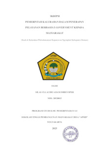 INTISARI Penerapan E-Government di desa merupakan bagian dari transformasi digital yang mendukung pembangunan dan pelayanan publik di tingkat desa. Pasca lahirnya Undang-Undang Desa No. 6 Tahun 2014, desa mendapatkan kewenangan yang lebih luas dalam mengelola anggaran dan mengatur urusan pemerintahan secara mandiri. Penerapan prinsip E-Government di desa bertujuan untuk menciptakan sistem pemerintahan yang lebih transparan, efisien, partisipatif, dan akuntabel, serta mampu menjawab berbagai tantangan di era digital. Dalam konteks desa, penerapan prinsip-prinsip E-Government menjadi krusial untuk mempercepat proses transformasi menuju desa yang lebih maju, cerdas, dan mandiri. Penerapan EGovernment di Kalurahan Widodomartani menghadapi sejumlah tantangan yang menjadi fokus dalam penelitian ini. Meskipun telah dilakukan upaya untuk mengintegrasikan teknologi digital dalam pelayanan publik, masih terdapat masalah terkait aksesibilitas teknologi bagi seluruh warga, kesenjangan pemahaman penggunaan platform digital,serta infrastruktur yang belum sepenuhnya mendukung Penelitian ini menggunakan metode kualitatif yang bersifat deskriptif. subjek dalam penelitian ini terdiri dari Pemerintah Kalurahan Widodomartani dan Masyarakat Kalurahan Widodomartani. Subjek dalam penelitian ini ditentukan melalui teknik purposive sampling. Hasil dari penelitian ini menunjukkan bahwa Pemerintah Kalurahan Widodomartani belum sepenuhnya menerapkan pelayanan administrasi kependudukan berbasis elektronik sesuai dengan peraturan pemerintah maupun peraturan Kabupaten Sleman yang berlaku. Meskipun ada upaya untuk menjalankan sistem E-Government, pelaksanaannya belum terwujud secara utuh dan justru terkesan semu. Pelayanan yang ada saat ini tidak memberikan dampak yang signifikan dalam hal efektivitas, efisiensi, maupun interaktivitas antara pemerintah kalurahan dan masyarakat. Bagi masyarakat, pelayanan E-Government yang ada belum mampu memberikan kemudahan yang diharapkan. Bahkan, bagi sebagian warga, sistem ini lebih dirasakan merugikan dan tidak menguntungkan karena kesulitan dalam mengakses aplikasi, keterbatasan pemahaman terhadap teknologi, dan kurangnya dukungan teknis yang memadai. Oleh karena itu, meskipun ada niat baik dalam mengimplementasikan E-Government, pemerintah Kalurahan Widodomartani perlu melakukan evaluasi dan perbaikan agar layanan berbasis elektronik dapat berjalan dengan lebih efektif, efisien, dan interaktif serta benar-benar memberikan manfaat bagi masyarakat. Kata Kunci: E-Government, Pelayanan Publik, Pemerintah Kalurhana