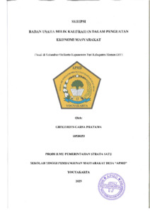 INTISARI Penelitian ini mengkaji Badan Usaha Milik Kalurahan (BUMKal) Gerbang Merapi dalam penguatan ekonomi masyarakat Kalurahan Girikerto, Kapanewon Turi, Kabupaten Sleman. Fokus utama penelitian mencakup pelatihan UMKM, bantuan modal usaha, dan pengelolaan unit-unit usaha desa sebagai instrumen pemberdayaan ekonomi lokal. Pelatihan UMKM terbukti mampu meningkatkan kapasitas pelaku usaha dalam hal manajemen, pemasaran, dan pengelolaan keuangan, sehingga mendorong pelaku UMKM menjadi lebih mandiri, produktif, dan berdaya saing. Bantuan modal yang diberikan oleh BUMKal, baik berupa hibah maupun pinjaman lunak, turut memperkuat fondasi usaha masyarakat, meskipun akses terhadapnya masih perlu diperluas dan disosialisasikan secara merata. Pengelolaan unit usaha BUMKal seperti Stasiun Pengisian Tangki Air (SPTA), catering, dan ekowisata juga berkontribusi terhadap peningkatan Pendapatan Asli Kalurahan (PAD) dan penciptaan lapangan kerja, sehingga berdampak langsung pada peningkatan kesejahteraan warga. Secara keseluruhan, BUMKal menjadi aktor penting dalam strategi penguatan ekonomi masyarakat karena tidak hanya menyediakan sumber daya dan peluang usaha, tetapi juga membangun sistem yang mendorong kemandirian ekonomi berbasis potensi lokal. Namun demikian, partisipasi masyarakat yang masih rendah, keterbatasan SDM, serta kurangnya kolaborasi eksternal menjadi tantangan yang perlu diatasi untuk memastikan keberlanjutan dan efektivitas penguatan ekonomi melalui BUMKal. Kata Kunci: BUM Desa, Pelatihan UMKM, Modal Usaha, Unit Usaha BUMKal, Penguatan Ekonomi Masyarakat.