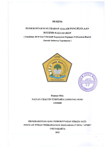 Landunau Huki, Salfan Chalvin (2025) PEMERINTAH KALURAHAN DALAM PENGELOLAAN POTENSI KALURAHAN ( Penelitian BUM Kal Triwidadi, Kapanewon Pajangan, Kabupaten Bantul Daerah Istimewa Yogyakarta ). Sarjana thesis, Sekolah Tinggi Pembangunan Masyarakat Desa "APMD".