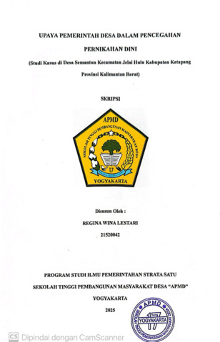 Lestari, Regina Wina (2025) UPAYA PEMERINTAH DESA DALAM PENCEGAHAN PERNIKAHAN DINI (Studi Kasus di Desa Semantun Kecamatan Jelai Hulu Kabupaten Ketapang Provinsi Kalimantan Barat). Sarjana thesis, Sekolah Tinggi Pembangunan Masyarakat Desa STPMD "APMD".