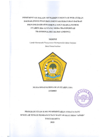 Syahputra, Kurniawan Muhammad (2025) PEMERINTAH DALAM MENGIMPLEMENTASI PERATURAN DAERAH (PENELITIAN IMPLEMENTASI PERATURAN DAERAH PROVINSI DAERAH ISTIMEWA YOGYAKARTA NOMOR 5 TAHUN 2016 TENTANG MODA TRANSPORTASI TRADISIONAL BECAK DAN ANDONG). Sarjana thesis, Sekolah Tinggi Pembangunan Masyarakat Desa "APMD".