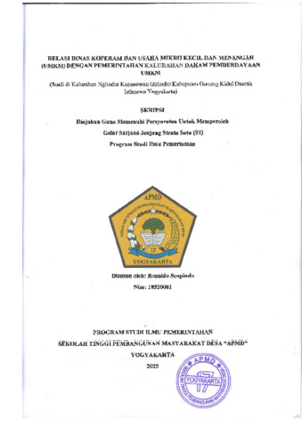 Scopindo, Ronaldo (2024) RELASI DINAS KOPERASI DAN USAHA MIKRO KECIL DAN MENENGAH (UMKM) DENGAN PEMERINTAHAN KALURAHAN DALAM PEMBERDAYAAN UMKM (Studi di Kalurahan Nglindur Kapanewon Girisubo Kabupaten Gunung Kidul Daerah Istimewa Yogyakarta). Sarjana thesis, Sekolah Tinggi Pembangunan Masyarakat Desa STPMD "APMD".