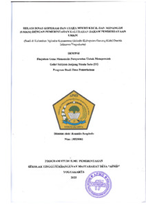 INTISARI Penelitian ini akan mengkaji tentang tindakan pemerintah terhadap pemberdayaan masyarakat melalui Usaha Mikro Kecil dan Menengah (UMKM) yang dilakukan di Kalurahan Nglindur, Kapanewon Girisubo, Kabupaten Gunung Kidul, Daerah Istimewa Yogyakarta yang dimana memiliki berberapa kendala dalam hal memasarkan produk hasil olahan masyarakat yang ketika produk tersebut di pasarkan dapat memberikan peluang bagi masyarakat pelaku Usaha Mikro Kecil dan Menengah (UMKM) untuk meningkatkan produktivitas dan ekonomi masyarakat yang ada di Kalurahan Nglindur. Penelitian ini menggunakan metode Deskriptif-Kualitatif dengan teknik pengumpulan data melalui observasi, wawancara, dan studi dokumen. Dimana objek penelitian ini adalah Pemerintah Kalurahan Nglindur dan Usaha Mikro Kecil dan Menengah (UMKM), yang berfokus pada bagaimana cara pemerintah dalam membangun relasi dengan dinas koperasi dan umkm dalam pemberdayaan masyarakat melalui Usaha Mikro Kecil dan Menengah (UMKM) di Kalurahan Nglindur. Informan dalam penelitian ini berjumlah 8 orang yang terdiri dari Pemerintah Kalurahan, Tokoh Masyarakat dan Pelaku Usaha Mikro Kecil dan Menengah (UMKM) Kalurahan Ngelindur. Analisis data dalam penelitian ini terdiri dari reduksi data, penyajian data dan penarikan kesimpulan. Kesimpulan Interaksi antara Dinas Koperasi dan UMKM dengan Pemerintah Kalurahan dalam Pemberdayaan Usaha Mikro Kecil dan Menengah di Kalurahan Nglindur dapat dikatakan cukup efektif, walaupun ada berberapa hal yang belum sepenuhnya optimal namun dengan adanya Interaksi dari Dinas Koperasi dan UMKM dengan Pemerintahan Kalurahan dalam mengupayakan agar pelaku Usaha Mikro Kecil dan Menengah di Kalurahan Nglindur dapat memproduksi produk dengan optimal dan memperkenalkan produk mereka melalui lapak yang disediakan di rest area dan mengupayakan agar berberapa produk dari Usaha Mikro Kecil dan Menengah mendapatkan label halan dan dapat memasuki laba alfamart dan lain sebagainya dalam hal ini dapat dikatakan efektif. Kolaborasi antara Pemerintah Kalurahan dengan Dinas Koperasi, Usaha Mikro Kecil dan Menengah memberikan ilmu bagi pelaku Usaha Mikro Kecil dan Menengah yang ada di Kalurahan Nglindur. Pemerintahan Kalurahan Maupun Dinas Sosial yang juga ikut terlibat dalam memberikan program bagi Pelaku Usaha Mikro Kecil dan Menengah yang ada di Kalurahan Nglindur. Dengan adanya program-program tersebut dapat memberikan wawasan bagi masyarakat pelaku Usaha Mikro Kecil dan Menengah di Kalurahan Nglindur baik cara pengolahan, pemasaran dan manajemen produk. walaupun sebagian besar Usaha Mikro Kecil yang ada di Kalurahan Nglindur memiliki kendala di bagian pemasaran namun dengan adanya program-program yang di luncurkan dari Dinas terkait maupun Pemerintah Kalurahan setidaknya dapat memeberikan pencerahan dan ilmu bagi Masyarakat Pelaku Usaha Mikro Kecil dan Menengah yang ada di Kalurahan Nglindur. Kata Kunci : Relasi, Usaha Mikro Kecil dan Menengah (UMKM), Pemberdayaan Masayarak