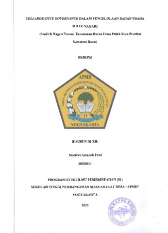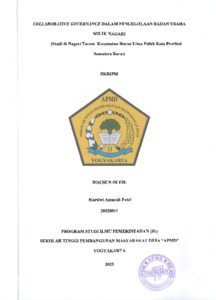 Putri, Azzarah Martiwi (2025) COLLABORATIVE GOVERNANCE DALAM PENGELOLAAN BADAN USAHA MILIK NAGARI (Studi di Nagari Taram Kecamatan Harau Kabupaten Lima Puluh Kota Provinsi Sumatera Barat). Sarjana thesis, Sekolah Tinggi Pembangunan Masyarakat Desa "APMD".