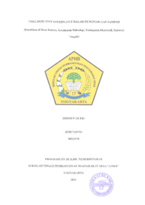 YANTO, JERI (2025) COLLABORATIVE GOVERNANCE DALAM PENGELOLAAN SAMPAH DI DESA KEUREA, KECAMATAN BAHODOPI, KABUPATEN MOROWALI, PROVINSI SULAWESI TENGAH. Sarjana thesis, Sekolah Tinggi Pembangunan Masyarakat Desa "APMD".