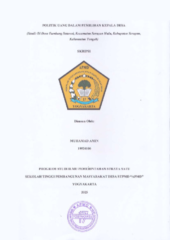 AMIN, MUHAMAD (2025) POLITIK UANG DALAM PEMILIHAN KEPALA DESA (Studi: Di Desa Tumbang Setawai, Kecamatan Seruyan Hulu, Kabupaten Seruyan, Kalimantan Tengah). Sarjana thesis, Sekolah Tinggi Pembangunan Masyarakat Desa "APMD".