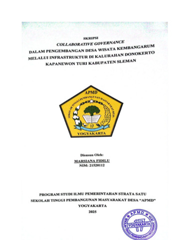 FIDILU, MARSIANA (2025) COLLABORATIVE GOVERNANCE DALAM PENGEMBANGAN DESA WISATA KEMBANGARUM MELALUI INFRASTRUKTUR DI KALURAHAN DONOKERTO KAPANEWON TURI KABUPATEN SLEMAN. Sarjana thesis, Sekolah Tinggi Pembangunan Masyarakat Desa STPMD "APMD".