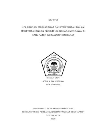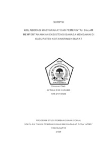KUSUMA, AFRIAN DWI (2025) KOLABORASI MASYARAKAT DAN PEMERINTAH DALAM MEMPERTAHANKAN EKSISTENSI BAHASA MENDAWAI DI KABUPATEN KOTAWARINGIN BARAT. Sarjana thesis, Sekolah Tinggi Pembangunan Masyarakat Desa STPMD "APMD".