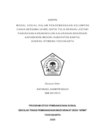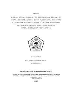 PRASOJO, NATANAEL ADAM (2025) MODAL SOSI AL DALAM PENGEMBANGAN KELOMPOK USAHA BERSAMA (KUBE) BATIK TULIS BERKAH LESTARI PADUKUHAN KARANGKULON KALURAHAN WUKIRSARI KAPANEWON IMOGIRI KABUPATEN BANTUL DAERAH ISTIMEWA YOGYAKARTA. Sarjana thesis, Sekolah Tinggi Pembangunan Masyarakat Desa STPMD "APMD".