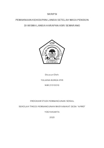 IPIR, YULIANA BUNGA (2025) PEMAKNAAN KEHIDUPAN LANSIA SETELAH MASA PENSIUN DI WISMA LANSIA HARAPAN ASRI SEMARANG. Sarjana thesis, Sekolah Tinggi Pembangunan Masyarakat Desa STPMD "APMD".