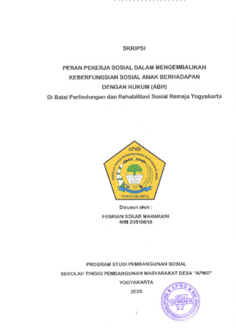 Maharani, Febrian Sekar (2025) Peran Pekerja Sosial dalam Mengambilkan Keberfungsian Sosial Anak Berhadapan dengan Hukum (ABH). Sarjana thesis, Sekolah Tinggi Pembangunan Masyarakat Desa STPMD "APMD".