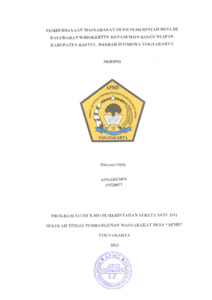 INTISARI Penelitian ini bertujuan mengetahui dan mendeskripsikan Pemberdayaan Masyarakat oleh Pemerintah Desa di Kalurahan Wirokerten. Pemerintah pusat mendukung desa-desa di indonesia dengan menyalurkan dana bagi setiap desa untuk mengelola wewenang dan aset desa. Fokus utamnya adalah pemberdayaan masyarakat menurut konsep Terry Wilson dari keempat tahap pemberdayaan awakening, understanding, harnessing dan using serta pemerintah desa melaksanakan fungsi governing dalam mengatur, mengurus, dan memberdayakan masyarakat secara mandiri, serta implementasi program berdampak pada kesejahteraan masyarakat melalui optimalisasi potensi dan penggunaan dana yang tersedia. Penelitian ini menggunakan metodologi penelitian kualitatif, pengumpulan data melalui 1) observasi, 2) wawancara, 3) studi dokumentasi. Dengan pendekatan purposive, pemerintah desa, masyarakat desa, tokoh masyarakat dipilih sebagai informan penelitian. Reduksi data, penyajian, verifikasi, dan investigasi semuanya termasuk dalam analisis data. Kalurahan Wirokerten, Kapanewon Banguntapan, Kabupaten Bantul, Daerah Istimewah Yogyakarta, yang menjadi locus penelitian. Hasil penelitian ini menunjukkan bahwa pada tahap awakening, pemerintah desa berhasil membangkitkan kesadaran masyarakat melalui sosialisasi, forum warga, dan pelibatan dalam musyawarah perencanaan pembangunan desa. Kesadaran masyarakat mulai tumbuh bahwa mereka memiliki hak, peran, dan kemampuan untuk ikut serta dalam pembangunan. Ini adalah fondasi penting dalam proses pemberdayaan yang mendorong partisipasi aktif dan pembentukan identitas kolektif sebagai warga yang memiliki agensi. Tahap understanding menunjukkan bahwa setelah masyarakat sadar, mereka juga memahami bagaimana struktur, tantangan, dan peluang pembangunan desa bekerja. Mereka tidak hanya tahu bahwa mereka penting, tetapi juga memahami bagaimana menggunakan peran tersebut secara strategis. Pemerintah desa juga semakin memahami pentingnya sinergi antara kebijakan top-down dan kebutuhan bottom-up. Hambatan seperti keterbatasan literasi, partisipasi semu, dan komunikasi antarwarga mulai dikenali dan dicarikan solusinya. Selanjutnya, tahap harnessing menggambarkan proses penting dalam mengidentifikasi dan memetakan potensi sumber daya yang ada di desa, baik sumber daya manusia, alam, sosial, maupun kultural. Masyarakat dan pemerintah desa mulai menggali potensi tersebut, mengorganisasi dalam bentuk kelompok usaha, pelatihan keterampilan, hingga pemberdayaan sektor informal. Kegiatan seperti pelatihan UMKM, pemanfaatan lahan kosong, serta pemberdayaan perempuan dan pemuda menunjukkan bahwa masyarakat mulai mampu mengorganisasi dirinya. Dalam tahap using, masyarakat telah mulai mempraktikkan hasil pemberdayaan dalam kehidupan nyata. Berbagai inisiatif warga, mulai dari pembentukan usaha kecil, koperasi wanita, hingga pengembangan produk lokal menunjukkan bahwa pemberdayaan sudah menjadi bagian dari kultur baru di Kalurahan Wirokerten. Penggunaan teknologi oleh pemuda untuk pemasaran digital dan penggunaan hasil usaha PKK untuk mendanai kegiatan sosial menjadi indikator kuat bahwa pemberdayaan berjalan secara substansial. pemberdayaan bukanlah proses instan. Ia menuntut waktu, ketekunan, dan kebijakan yang fleksibel. Setiap tahap saling berkaitan dan tidak dapat dilewati begitu saja. Kesadaran tanpa pemahaman akan menimbulkan partisipasi semu; penggalian potensi tanpa kesadaran akan memunculkan ketergantungan baru; dan penggunaan hasil tanpa penguatan kelembagaan akan mudah rapuh. Kata Kunci: Pemberdayaan Masyarakat, Pemerintah Desa, Governing Desa
