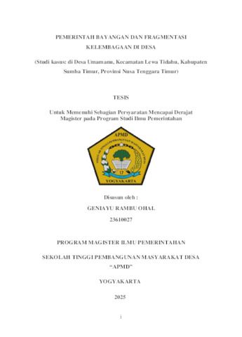Rambu Ohal, Geniayu (2025) PEMERINTAH BAYANGAN DAN FRAGMENTASI KELEMBAGAAN DI DESA (Studi kasus: di Desa Umamanu, Kecamatan Lewa Tidahu, Kabupaten Sumba Timur, Provinsi Nusa Tenggara Timur). Masters thesis, Sekolah Tinggi Pembangunan Masyarakat Desa STPMD "APMD".