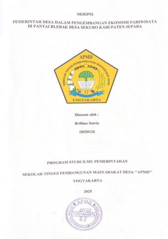 Satria, Brillian (2025) Pemerintah Desa dalam Pengembangan Ekonomi Pariwisata di Pantai Blebak Desa Sekuro Kabupaten Jepara. Sarjana thesis, STPMD"APMD".