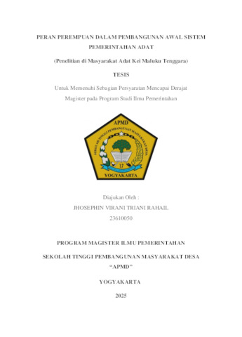 Rahah, Jhosephin Virani Triani (2025) PERAN PEREMPUAN DALAM PEMBANGUNAN AWAL SISTEM PEMERINTAHAN ADAT (Penelitian di Masyarakat Adat Kei Maluku Tenggara). Masters thesis, Sekolah Tinggi Pembangunan Masyarakat Desa STPMD "APMD".