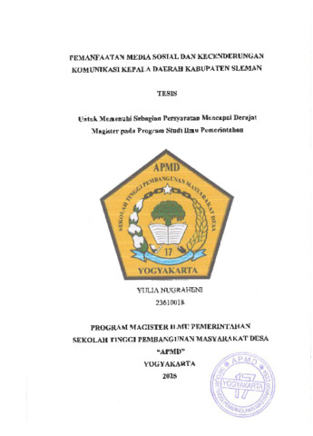 Nugraheni, Yulia (2025) Pemanfaatan Media Sosial Dan Kecenderungan Komunikasi Kepala Daerah Kabupaten Sleman. Masters thesis, Sekolah Tinggi Pembangunan Masyarakat Desa STPMD "APMD".